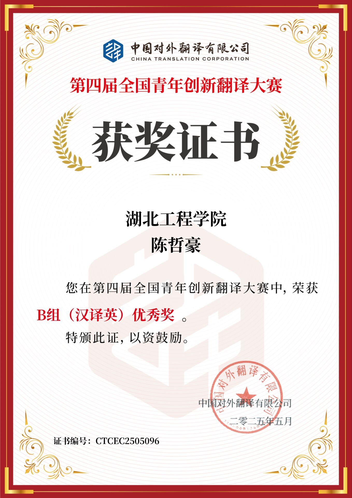 近日,第四届全国青年创新翻译大赛(China Young Translators’ Contest,简称CYTC)圆满落下帷幕。经过激烈角逐,公司学子陈哲豪荣获B组(汉译英)三等奖和优秀奖。