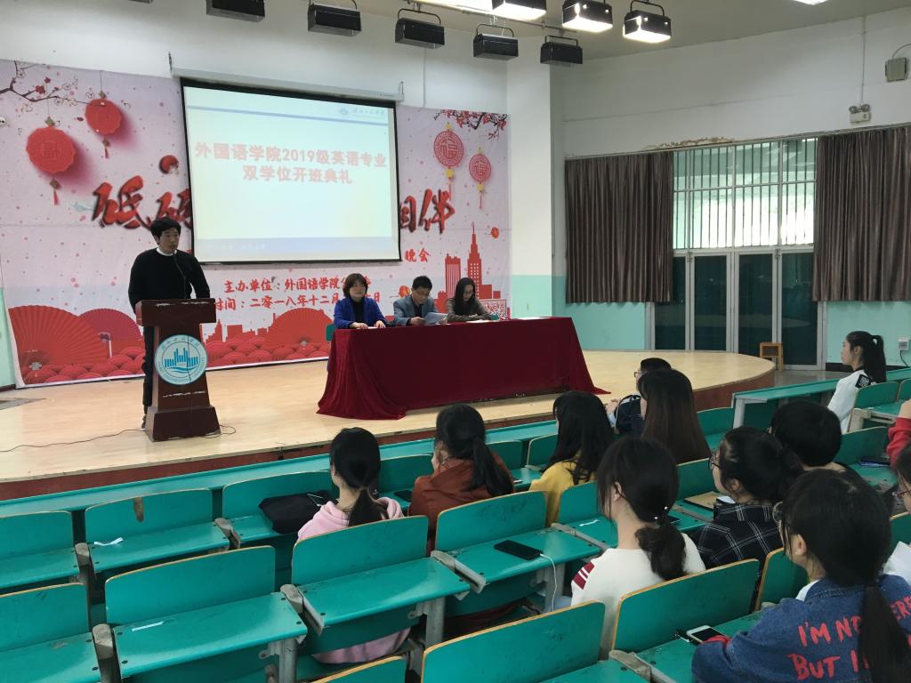 4月12日下午4点,bevictor伟德2019级英语双学位开班典礼在外语楼报告厅举行。参加此次开班典礼的有bevictor伟德副经理肖美良教授、双学位班主任吕苏、黄芳华、赵国涛老师,以及来自全校其他院系的100多名员工。