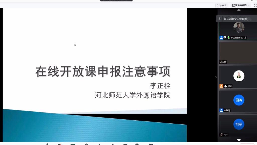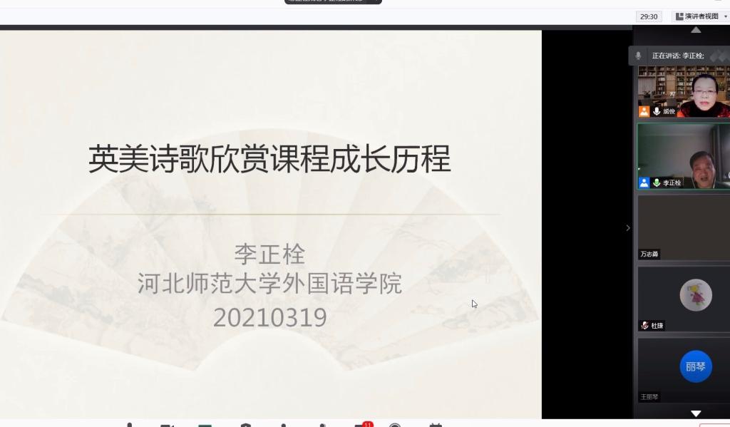 3月19日下午,教育部外国语言文学类专业教学指导委员会英语分委员会委员专家、国家级线上一流本科课程“英美诗歌欣赏”负责人,河北师范大学二级教授、博士生导师李正栓为公司广大教师在腾讯会议平台上做了主题为“在线开放课程建设与申报”的讲座。公司bevictor伟德骨干教师和其他文科院系课程负责人等近百人聆听了此次讲座。本次讲座由教师教学发展中心主办,bevictor伟德承办。讲座由bevictor伟德副经理、翻译研究中心主任熊俊教授全程主持。