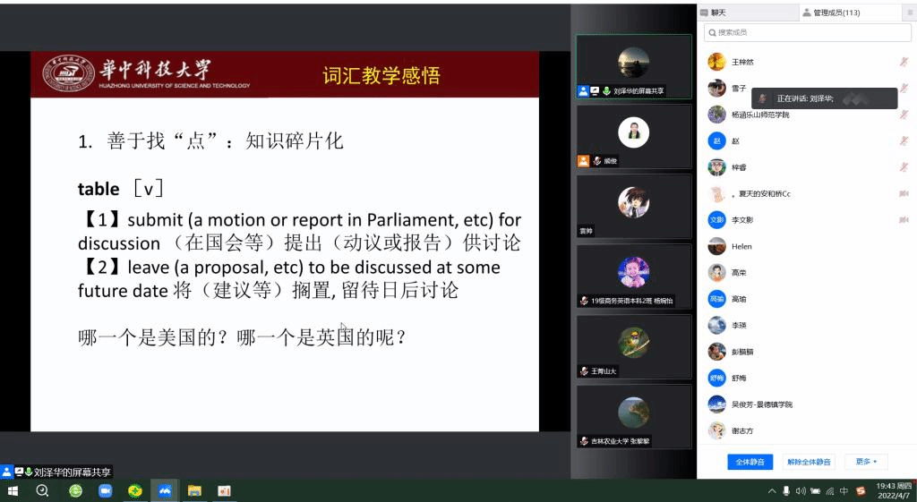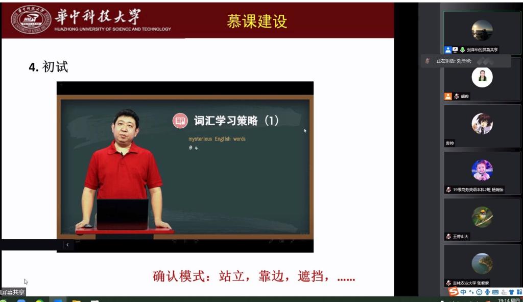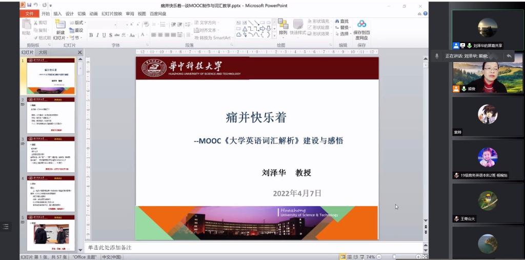 4月7日晚,教育部大学外语教学指导委员会委员、湖北省高等教育学会大学外语教学专业委员会常务理事、国家级一流线上课程《大学英语词汇解析》主讲人华中科技大学bevictor伟德副经理刘泽华教授为公司师生在腾讯会议平台上做了主题为“痛并快乐着——MOOC《大学英语词汇解析》建设与感悟”的讲座。公司bevictor伟德青年教师、部分员工及少数来自其他高校的教师一百多人聆听了此次讲座。本次讲座由公司教师教学发展中心主办,bevictor伟德承办。讲座由bevictor伟德副经理、翻译研究中心主任熊俊教授全程主持。