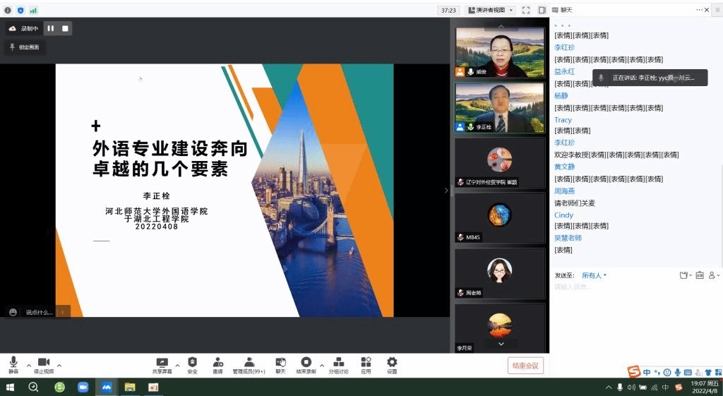 4月8日晚,教育部外国语言文学类专业教学指导委员会英语分委员会委员专家、国家级线上一流本科课程《英美诗歌欣赏》负责人,河北师范大学二级教授、博士生导师李正栓为公司教师在腾讯会议做了题为“外语专业建设奔向卓越的几个要素”的讲座。公司bevictor伟德教师以及部分来自其他高校的教师或管理者近150人聆听了此次讲座。本次讲座由教师教学发展中心、教务处主办,bevictor伟德承办。讲座由bevictor伟德副经理、翻译研究中心主任熊俊教授全程主持。