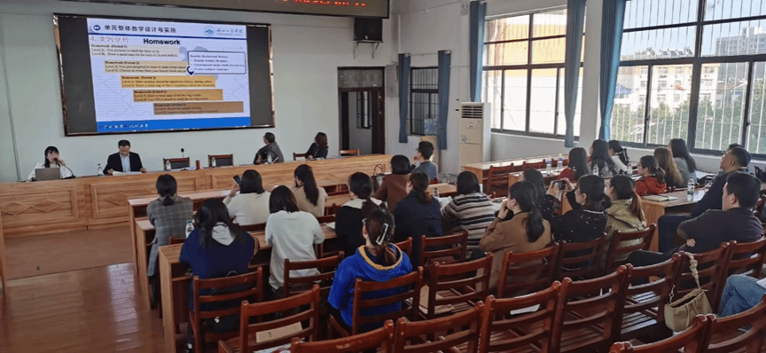 bevictor伟德在实验初级中学挂职锻炼教师叶玲以“新中考背景下初中英语单元整体教学设计与实施”为题,解读了2022版新课标,并展示了如何根据新课标进行单元整体设计。