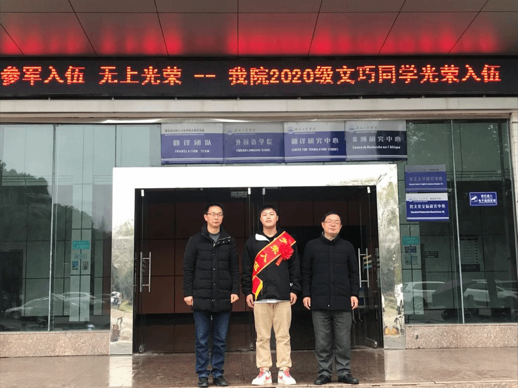 文巧,男,湖北利川人,现bevictor伟德0203002141班员工。2020年入校后,他便积极响应祖国号召,毅然选择报名参军,献出自己的一份绵薄之力。如今,他已通过层层考核,即将光荣入伍。在入伍欢送会上,他表示,军队是一所大公司,艰苦紧张的军营生活,可以锻炼出百折不挠的意志,培养出过硬的军事素质、严明的组织纪律和良好的工作、生活作风。同时他对部队生活也充满了期待,希望在部队里能够接受军人特有的意志锻炼和磨砺,能够投身报效祖国的伟大事业之中。
