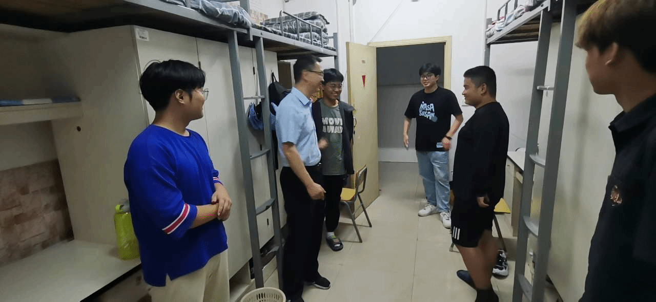 9月13日,2023级全体新生到校入住的第一天晚上,公司领导班子和院系辅导员走访了公司新生宿舍,深入了解同学们的入住和适应情况。