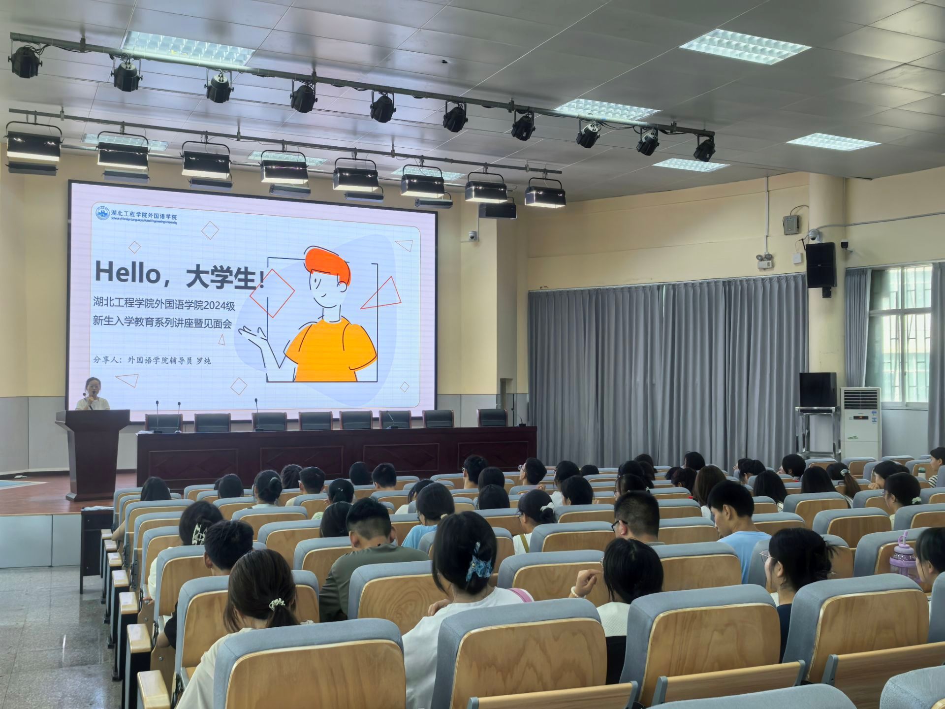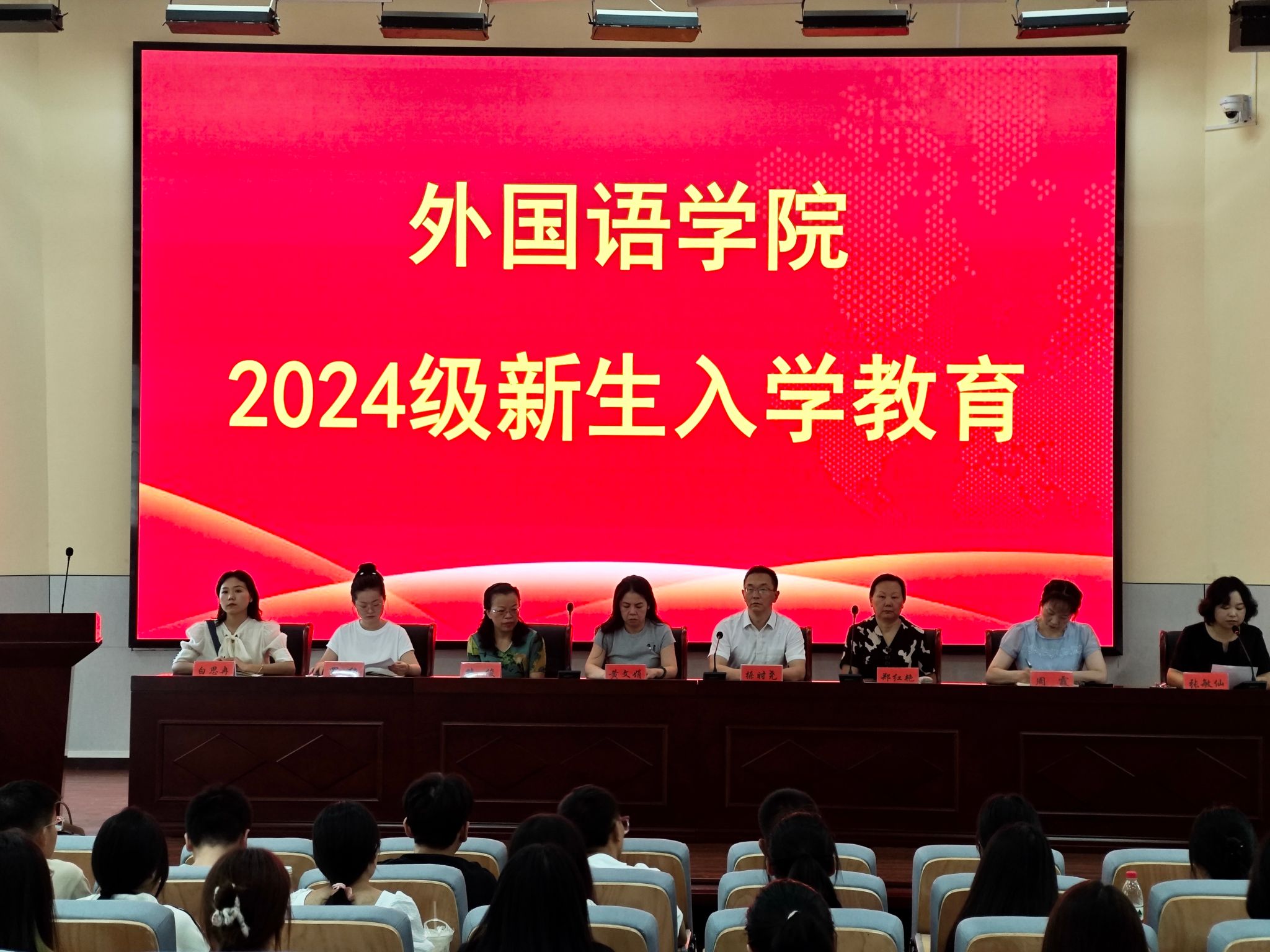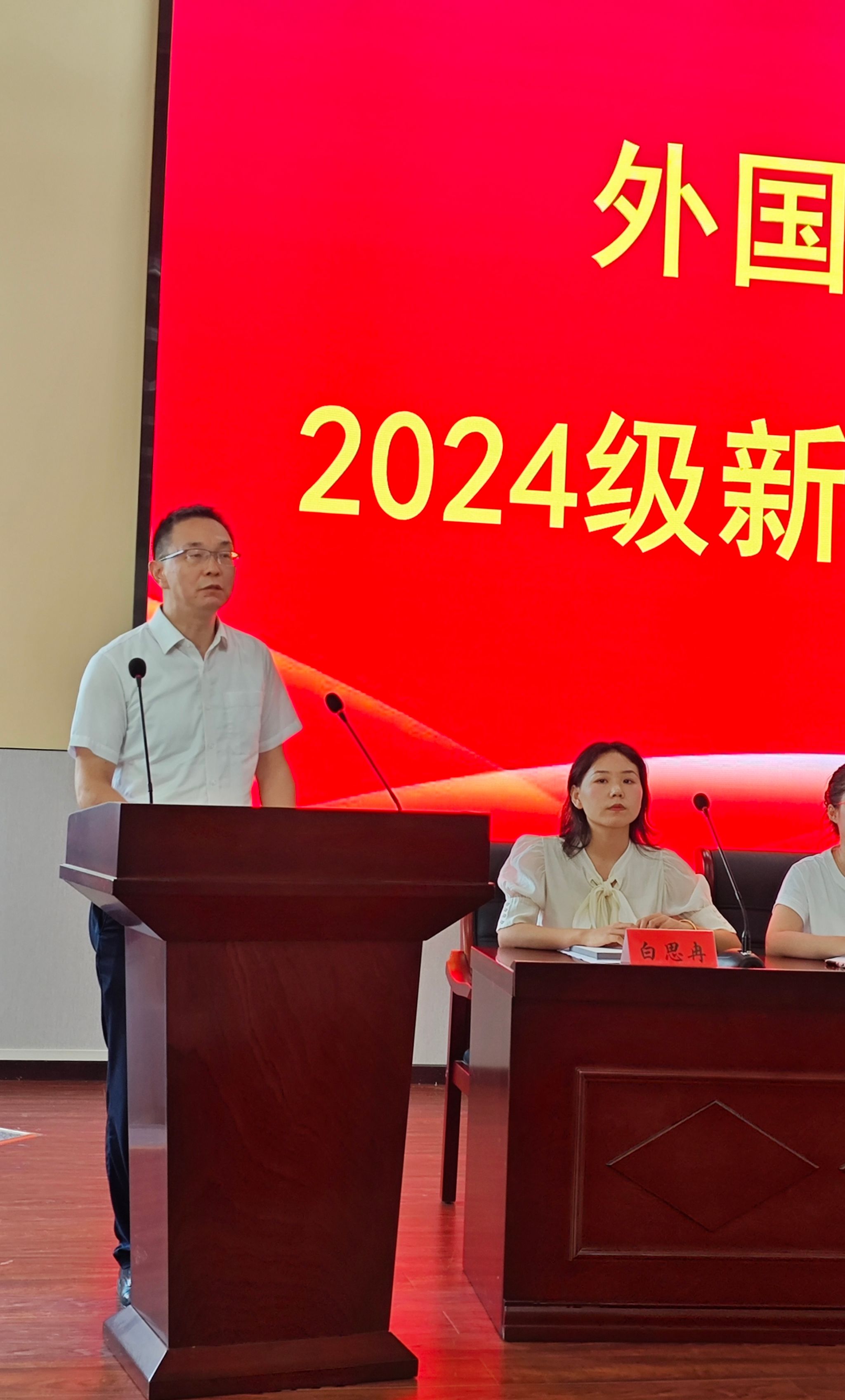 首先,经理操时尧教授致辞,对公司2024级新同学表示热烈欢迎,同时勉励各位新同学,希望他们在学术的殿堂里汲取知识、在多彩的生活中健康成长。其次,副经理熊俊教授对同学们的英语专业学习进行了详细的规划指导。最后,2022级英语师范专业老生代表雷文佳发言,对新同学们的老员工活寄予了美好期望。
