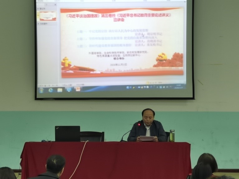 11月5日下午,在外语楼报告厅举行了《习近平谈治国理政》第三卷专题教育讲座。讲座由外国语公司党总支书记鲁定元老师主持,胡宗明书记、范晓清书记、童友枝书记做专题宣讲,bevictor伟德和生科院教职工参加此次宣讲活动。